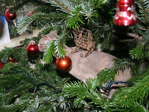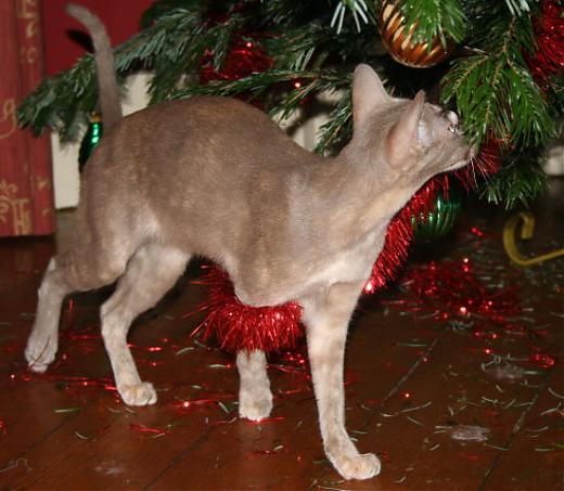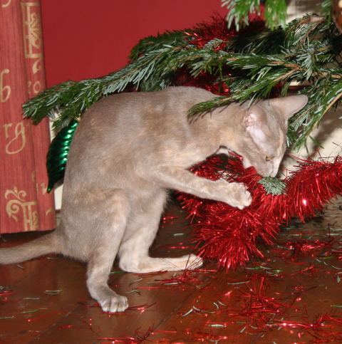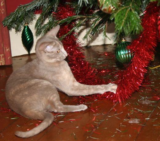 Good Lord, she's really shredded that garland! And the one with her foot tangled in it is priceless!! What a mess, and she's having so much fun with her first Christmas tree..... ![]() |