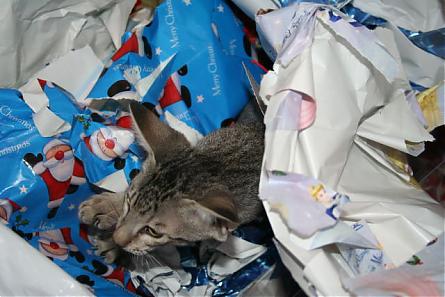 They look thoroughly tuckered out...what a lovely day they must have had with all the wrapping paper to dive into! Leia had fun with my pile also; haven't picked it up yet! |